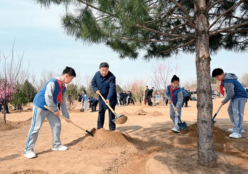 2025年4月3日,党和国家领导人习近平、李强、赵乐际、王沪宁、蔡奇、丁薛祥、李希、韩正等来到北京市丰台区永定河畔参加首都义务植树活动。这是习近平同大家一起植树。 新华社记者 谢环驰/摄